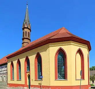 Das Bauwerk wurde im Wesentlichen aus Mauersteinen errichtet, die anschließend verputzt und in einem ockerfarbenen Ton angestrichen wurden. Der Chor ist nicht eingezogen und hat einen Fünfachtelschluss. Alle Öffnungen wurden als Spitzbogenfenster mit profiliertem Gewände aus doppelten Rundstäben ausgeführt, die anschließend in einem rötlichen Ton bemalt wurden. Die drei dem Chorschluss zugeneigten Seiten sind jedoch vermauert; im Chorschluss ist eine ebenfalls zugesetzte, spitzbogenförmige Pforte.