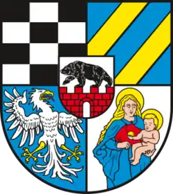 Blasonierung: „Geviert, belegt mit einem Herzschild; Feld 1: 12fach schwarz-silbern geschacht, Feld 2: in Blau zwei schräglinke goldene Pfähle, Feld 3: in Blau ein links gewendeter goldbewehrter silberner Adler mit roter Zunge, Feld 4: in Silber eine Madonna, blau gekleidet mit rotem Untergewand, mit dem Kind auf dem Arm, das Kind einen goldenen Apfel in der rechten Hand haltend, beide golden nimbiert. Der Herzschild zeigt in Silber einen schreitenden schwarzen Bären auf roter, schwarz gefugter Zinnenmauer mit offenem Tor.“ |