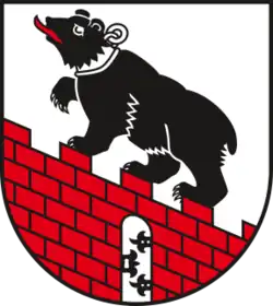 Blasonierung: „In Silber ein schreitender schwarzer Bär mit silbernem Halsband und roter heraushängender Zunge auf einer schrägrechts aufsteigenden roten, schwarz gefugten Zinnenmauer mit geschlossenem silbernen Tor, das links schwarze Türbeschläge und rechts ein schwarzes Schloß enthält.“ |