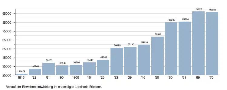 Nach der Auflösung Preußens fiel der nun zur Britischen Besatzungszone gehörende Kreis am 23. August 1946 an das neu gebildete Land Nordrhein-Westfalen und wurde seit 1953 als Landkreis bezeichnet. Hückelhoven wurde am 7. Januar 1950 in Hückelhoven-Ratheim umbenannt. Die Gemeinde Hückelhoven-Ratheim wurde 1969 zur Stadt erhoben. Am 1. Oktober 1969 wurde aus dem Landkreis der Kreis Erkelenz.[4] Am 1. Januar 1972 wurde der Kreis Erkelenz durch das Aachen-Gesetz aufgehoben und mit dem größten Teil des Selfkantkreises Geilenkirchen-Heinsberg zum neuen Kreis Heinsberg zusammengelegt.[5] Gleichzeitig kam es zu einer umfassenden Gemeindereform: