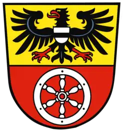 Blasonierung: „Geteilt von Gold und Rot; oben ein rot bewehrter schwarzer Adler mit silbernem Brustschild, darin ein schwarzer Balken, unten ein sechsspeichiges silbernes Rad.“