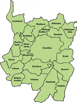 Am 15. Juni 1950 erhielt der Landkreis Jerichow II den Namen Landkreis Genthin. Die Gemeinde Reesen wurde in den Landkreis Burg umgegliedert.[2] Am 13. Juli wurden die Gemeinden Göttlin, Grütz, Kirchmöser, Kützkow und Neue Schleuse aus dem Landkreis Genthin in den Landkreis Westhavelland umgegliedert.[3]
