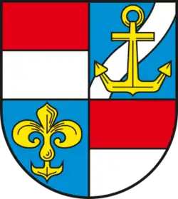 Blasonierung: „Geviert; Feld 1 und 4: von Rot über Silber geteilt; Feld 2: in Blau ein silberner Wellenschräglinksbalken, belegt mit einem goldenen Anker; Feld 3: in Blau eine goldene heraldische Lilie.“