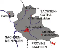 In der Folge des Deutschen Krieges 1866 annektierte Preußen das Kurfürstentum Hessen und wandelte dieses, zusammen mit dem Herzogtum Nassau, am 7. Dezember 1868 in die Provinz Hessen-Nassau um. Hierbei wurde der Kreis Schmalkalden dem Regierungsbezirk Kassel zugeordnet. Ab dem 23. Mai 1907 trug der Kreis die Bezeichnung Herrschaft Schmalkalden.[4]