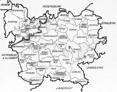 - Die Gemeinden Buchhausen, Eggmühl, Inkofen, Mannsdorf, Oberdeggenbach, Pinkofen, Schierling, Unterlaichling und Zaitzkofen kamen zum Landkreis Regensburg.[3][4]