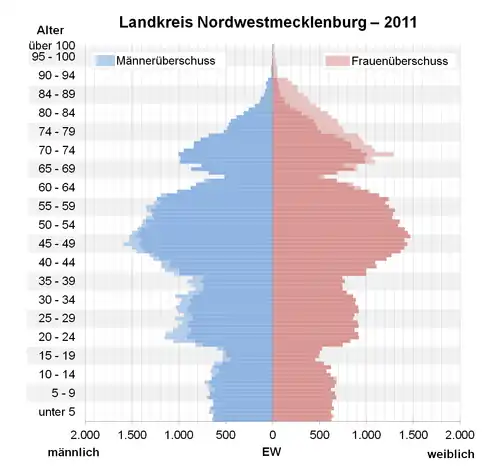 - ↑ Datenbank Zensus 2011, Kreis Nordwestmecklenburg, Alter und Geschlecht ( des vom 22. September 2021 im Internet Archive) Info: Der Archivlink wurde automatisch eingesetzt und noch nicht geprüft. Bitte prüfe Original- und Archivlink gemäß Anleitung und entferne dann diesen Hinweis.