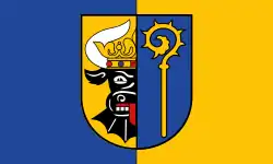 Blasonierung: „Gespalten; vorn in Gold ein halber hersehender, golden gekrönter schwarzer Stierkopf am Spalt mit aufgerissenem roten Maul, silbernen Zähnen, ausgeschlagener roter Zunge, in sieben Spitzen abgerissenem Halsfell und silbernen Hörnern; hinten in Blau ein goldener Bischofsstab.“[16] |
