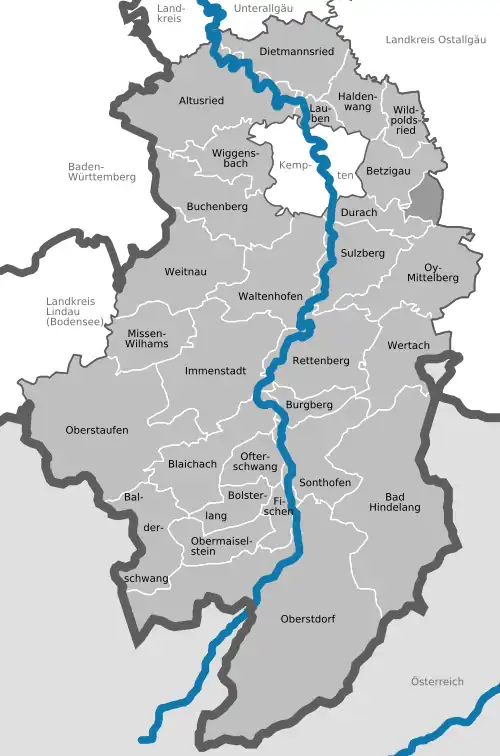 Im Rahmen der Gebietsreform in Bayern wurde am 1. Juli 1972 der größte Teil des Landkreises Kempten (Allgäu) mit dem Landkreis Sonthofen zum neuen Landkreis Oberallgäu vereinigt. Die beiden Gemeinden Sankt Lorenz und Sankt Mang des Landkreises Kempten wurden in die kreisfreie Stadt Kempten eingegliedert.[5] Heute besteht der Landkreis Oberallgäu aus 28 Gemeinden.
