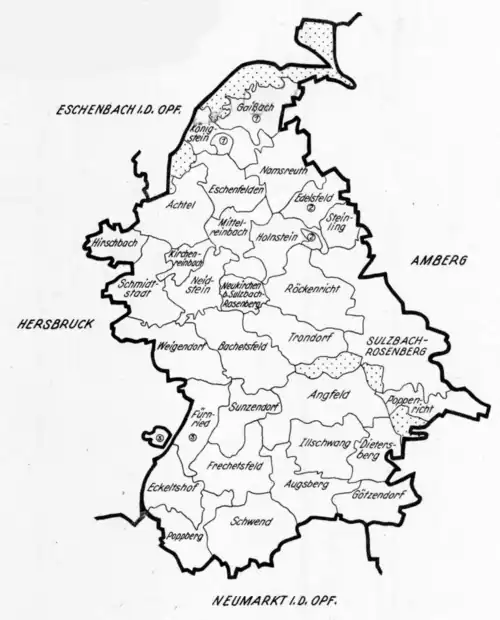 Am 1. Januar 1939 wurde wie sonst überall im Deutschen Reich die Bezeichnung Landkreis eingeführt.[2] So wurde aus dem Bezirksamt Sulzbach-Rosenberg der Landkreis Sulzbach-Rosenberg.