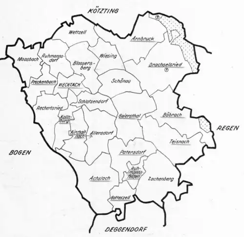 Vor dem Beginn der bayerischen Gebietsreform umfasste der Landkreis Viechtach in den 1960er Jahren 23 Gemeinden:[12]