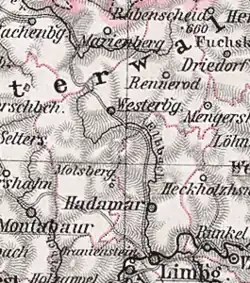 Bei der preußischen Gebietsreform vom 1. Oktober 1932 wurden die drei bestehenden Westerwaldkreise zu zwei Kreisen zusammengefasst. Aus dem Kreis Westerburg wechselten die Gemeinden Girod, Goldhausen, Görgeshausen, Großholbach, Heilberscheid, Hundsangen, Kleinholbach, Nentershausen, Niedererbach, Nomborn, Obererbach, Oberhausen, Pütschbach, Ruppach, Steinefrenz und Weroth in den Unterwesterwaldkreis. Das restliche Kreisgebiet wurde mit dem Oberwesterwaldkreis zu einem neuen Kreis zusammengeschlossen, der zunächst vorübergehend Landkreis Westerburg[3] und seit 1933 Oberwesterwaldkreis hieß.