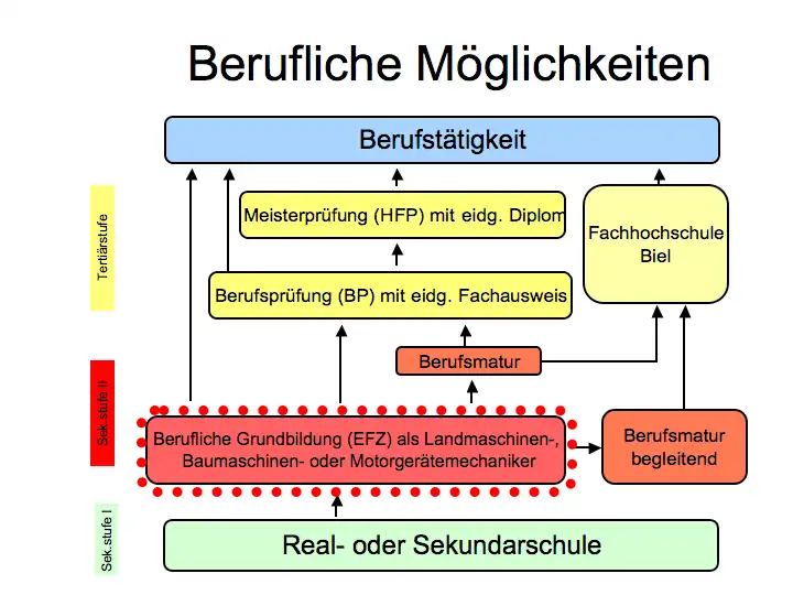 Das eidgenössische Fähigkeitszeugnis (EFZ) ermöglicht dem Besitzer den Einstieg in die höhere Berufsbildung. So kann er sich beispielsweise zum Landmaschinen-Werkstattleiter (BP mit eidg. Fachausweis) oder zusätzlich zum Landmaschinenmechaniker-Meister (HFP mit eidg. Diplom) ausbilden. Weitere Möglichkeiten, siehe Grafik.