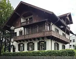 Das Gebäude ist ein Satteldachbau im alpenländischen Landhausstil. Es ist asymmetrisch gegliedert und besitzt ein Rundbogenportal, einen Obergeschoss-Balkon, Eckerker und eine Giebellaube. Es wurde 1905 als Wohn- und Bürogebäude von Johann Ostler errichtet. Die wandfeste Innenausstattung ist zum Teil in Jugendstilformen gehalten. Das Haus ist jetzt Teil des Landratsamt Garmisch-Partenkirchen.[1]