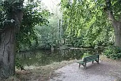 Wanderer und Radfahrern rasten im Sommer auf den Bänken an der Ostseite des Weihers Vilgensee, da ihnen die hohen Bäume am Weiher Schatten spenden