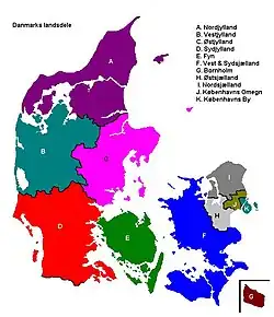 Für Parlamentswahlen ist Dänemark in Wahlkreise, Großkreise und drei Landesteile aufgeteilt. 2007 wurden diese Landesteile neu geordnet. Sie dienen als Grundlage u. a. für die Verteilung von Parlamentssitzen auf Parteilisten nach den jeweiligen Wählerstimmen und bei der Berücksichtigung von Kandidaten innerhalb dieser Listen.[1]