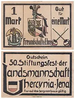 Es ist durchaus üblich bei Studentenverbindungen bei großen Veranstaltungen mit Biermarken, Gutscheinen etc. gezahlt wird. Die Landsmannschaft Hercynia Jena war die einzige bekannte Studentenverbindung, die zu ihrem 50. Stiftungsfest 1922 dafür ein Notgeld herausgegeben hat, das auch nach dem Stiftungsfest seine Gültigkeit behalten hat. Es gab Scheine im Wert 1, 3, 5 und 10 Mark. Das Notgeld der Landsmannschaft gehört heute zu den seltensten Geldscheinen.[8][9]