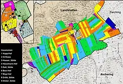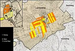 Der Sedelhof „Mayr“ (gelb), Haus Nr. 7, wurde unter Brüdern geteilt. Dadurch entstand „Baur“, Haus Nr. 6, der die orange markierten Felder übernahm. Im Anschluss an die Felder des Sedelhofes setzte eine weitere Kultivierung der landwirtschaftlich nutzbaren Flächen ein. Zunächst durch das dorfmittig gelegene und hier grün dargestellte Anwesen Nr. 4, den „Häuselmann-Hof“, der – was aus der Lage der Felder zu schließen ist – ebenfalls geteilt wurde. Seine Hälfte erhielt das Anwesen Nr. 1 (blau), der Kopp-Hof. Bei jedem dieser vier etwa gleich großen Höfe erlaubte das Kloster den Bau einer Sölde, deren Landbesitz ohne Bedeutung war. Ihre Bewohner verdienten sich ihren Lebensunterhalt als Tagelöhner und Handwerker. Mit diesen acht Anwesen und einem Häuschen für den Dorfhirten war die Entwicklung des Dorfes spätestens am Anfang des 16. Jahrhunderts abgeschlossen.