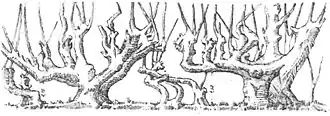 „Die Anstalt ward auf folgender Art getroffen. Man warf (schnitt) die in diesem Bezirke stehenden Bäume in verschiedener Höhe ab, ließ solche neuerdings ausschlagen und bog die hervorgeschossenen Zweige nieder (biegen-bücken). Diese wuchsen in der ihnen gegebenen Richtung fort, flochten sich dicht ineinander, und brachten in der Folge eine so dicke und verwickelte Wildnis hervor, die Menschen und Pferden undurchdringlich war.“