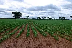 Mais wird in ganz Brasilien angebaut. Die mit Mais bepflanzte Fläche ist von 13,3 Millionen Hektar im Jahre 2003 auf 15,8 Millionen Hektar im Jahre 2015 gestiegen.[11] Die Ernte wuchs ebenfalls, von 48,3 Millionen Tonnen (2003) auf 85,3 Millionen Tonnen (2015).[11] Die Produktivität stieg somit von 3,7 Tonnen (2003) auf 5,5 Tonnen pro Hektar,[11] liegt mit diesem Wert aber deutlich unter der Produktivität im europäischen oder US-amerikanischen Maisanbau.[12] Im Jahr 2011/2012 war Brasilien der viertgrößte Maisproduzent nach den USA, China und der EU.[12] Die wichtigsten Anbaugebiete für Mais liegen dabei im Süden des Landes. Die Hälfte der Ernte 2006 stammte aus den vier Bundesstaaten Paraná, Rio Grande do Sul, Santa Catarina und São Paulo. Dort werden auch die höchsten Erträge pro Hektar erzielt.[13] In den wichtigsten Anbaugebieten ist eine Winter- und Sommerernte möglich. Im Jahre 2006 wuchs 94 Prozent der Maisernte auf künstlich bewässerten Feldern, 82 Prozent wurden chemisch gedüngt, 74 % mit Pestiziden behandelt und etwa ein Drittel der Ernte wurde von Hand eingebracht.[14]