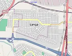 Langa liegt rund 15 Kilometer[2] südöstlich des Kapstädter Stadtzentrums. 2011 lebten dort 52.401 Menschen auf 2,87 km².[3] Im Westen wird es von der Straße Jan Smuts Drive begrenzt, im Süden von der Nationalstraße N2 und im Osten von der Schnellstraße M7. Nördlich verläuft eine Bahnstrecke. Gelegentlich wird Langa zum Gebiet Cape Flats gezählt,[1] das jedoch erst ab den 1950er Jahren entstand.