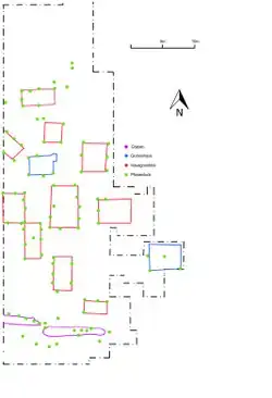 Auf der vom Hochwasser geschützten Terrasse am Südhang finden sich Spuren der ehemaligen Siedlung. In einer Tiefe von ca. 0,4 m zeichnen sich im sandigen Untergrund Pfostenlöcher, Grundrisse von Vorratsgruben und zwei Grubenhäusern ab. Eine besondere Ausrichtung der Gebäude auf einen Platz oder Weg ist nicht zu erkennen. Die langrechteckigen Firstpfostenbauten machen den größten Teil der Befunde aus. Sie sind von kleineren Vierpfostenbauten umgeben. Die zwei tiefer liegenden, quadratischen Pfostengruben können als Speicherbauten angesprochen werden. Die gefundene Keramik innerhalb der Siedlung besteht hauptsächlich aus importierter Drehscheibenware aus linksrheinisch, römischen Gebieten.[14] In der Nähe des nördlichen Grubenhauses befindet sich ein Rennofen, in dessen Umfeld Reste von Eisenschlacke in Lehmbrocken gefunden wurde. Im östlichen Grubenhaus wurde auf dem Hausboden Reste von einer Herdplatte und Fragmente von Schmelztiegeln gefunden. Hierzu kommen zerkleinerte Stücke von spätrömischen Bronzegefäßen und Militaria.[15] Im Süden der Siedlung lassen die zweireihigen Pfostenlöcher und zwei Gräben einen massiven Zaun zum Siedlungsschutz gegen Angreifer und Hochwasser vermuten. Im Brandschutt innerhalb der Gräben wurde eine spätrömische Geschossspitze und verbrannte Menschenknochen gefunden.[14]
