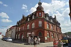 - Nr. 48: 2-gesch. verklinkertes Haus aus der Gründerzeit (D) mit 3-gesch. Ecktürmchen mit achteckiger Glockenhaube und Laterne sowie zwei Giebelrisaliten, ehemalige Drogerie und Ratskeller; heute Verwaltungsgebäude der Stadtverwaltung, 2006: mit Relief zum letzten Hexenprozess gegen Anna Kröger von 1697