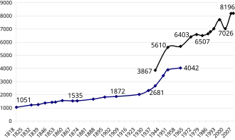 Die folgende Übersicht zeigt die Einwohnerzahlen der Gemeinde Langenberg nach dem jeweiligen Gebietsstand, bei einigen Jahren zusätzlich nach heutigem Gebietsstand. Bei den Zahlen handelt es sich bis 1970 und für 1987 um Volkszählungsergebnisse[12][13][14][15] und ab 1975 um amtliche Fortschreibungen des Landesamtes für Datenverarbeitung und Statistik.[16] Die Zahlen von 1975 bis 1985 sind geschätzte Werte, die Zahlen ab 1990 Fortschreibungen auf Basis der Ergebnisse der Volkszählung von 1987. Die Angaben beziehen sich ab 1871 sowie für 1946 auf die Ortsanwesende Bevölkerung, ab 1925 auf die Wohnbevölkerung und ab 1985 auf die Bevölkerung am Ort der Hauptwohnung. Vor 1871 wurden die Einwohnerzahlen nach uneinheitlichen Erhebungsverfahren ermittelt.