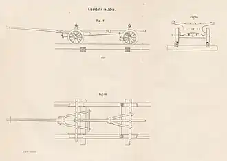 Die übrigen Teile des Wagens waren aus Buchenholz, an jenen Stellen, wo sie besonders in Anspruch genommen wurden, mit Eisenschienen beschlagen. Der Radstand betrug 1,20 m, die auf den Achsen befestigten Traghölzer erhielten eine Länge von 90–105 cm, was der Weite des Beladungsraumes gleichkam.