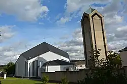 1967 wurde die heutige katholische Lantershofener Kirche geweiht und unter das Patrozinium des heiligen Lambert von Lüttich gestellt. Sie hat, basierend auf einem Entwurf des Architekten Josef Westermeier und angelehnt an die Hauskapelle der Weißen Schwestern zu Trier, eine fünfeckige Grundform und einen säulenfreien Innenraum. Als Seitentrakt der Kirche, vor der in einem Anbau befindlichen Sakristei, wurde eine Beicht- und Marienkapelle mit einer barocken Marienstatue integriert. Diese Statue war bereits in den beiden Vorgängerbauten der heutigen Kirche vorhanden. Erst im Folgejahr, 1968, wurde der freistehende zwanzig Meter hohe Kirchturm errichtet.[51] 1982 wurde ein ebenfalls noch aus den Vorgängerbauten in die heutige Kirche übernommenes Kruzifix restauriert. Hierbei stellte sich heraus, dass es sich nicht, wie zunächst angenommen, um eine Arbeit aus dem 18. Jahrhundert, sondern um ein mehrfach überstrichenes spätromanisches oder frühgotisches Kreuz aus dem 13. Jahrhundert handelt, das möglicherweise schon zur frühen Ausstattung der 1253 geweihten Kapelle gehörte.[45]