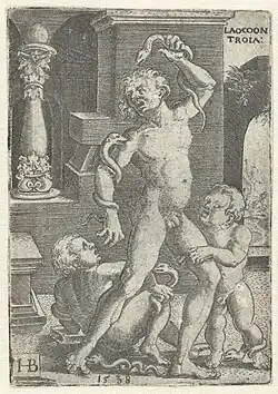 Aus der Renaissance sind unter anderem Holzschnitte mit Laokoondarstellungen aus der ersten Vergilausgabe in Deutschland, dem so genannten Straßburger Vergil des Jahres 1502, überliefert. Verantwortung trugen für diese Ausgabe Hans Grüninger und Sebastian Brant; Thomas Murner übernahm die Holzschnitte in seine Vergilausgabe. Aus der Zeit vor der Entdeckung der Laokoon-Gruppe im Jahr 1506, die die meisten nachfolgenden Laokoondarstellungen beeinflusste, ist noch eine Handzeichnung von Filippino Lippi zu einem geplanten Fresko erhalten. Diese Zeichnung steht vermutlich ebenso wie die früheren Miniaturen in Vergils Tradition oder laut Georg Lippold in der Tradition der pompejanischen Wandbilder und hängt nicht von anderen, verlorenen Bildquellen ab. Da auch Laokoons Frau und eine Tempelarchitektur dargestellt sind, führt Richard Foerster die Darstellung auch auf die von Servius paraphrasierte Fassung von Euphorion oder Hyginus zurück. Für den Klassischen Archäologen Arnold von Salis steht Lippis Zeichnung trotz klarer Unabhängigkeit von der Laokoon-Gruppe noch eher in der antiken Tradition als die Abbildungen in den Vergilhandschriften. Vorbild sei wohl ein altes römisches Wandgemälde, das mit denen in Pompeji verwandt sein könne und auch die Laokoondarstellung in der Vergilhandschrift in der Vatikanischen Bibliothek habe beeinflussen können.[75] Von der Laokoon-Gruppe unabhängige spätere Werke befassen sich vorwiegend mit dem von Vergil erwähnten Opfer für Poseidon und dem Speerstoß ins Pferd oder präsentieren die Toten unabhängig von der Darstellung der Gruppe. So schuf zwar Hans Brosamer 1538 noch einen der Gruppe ähnlichen Kupferstich, Nicolò dell’Abbate aber vor 1552 zwölf unabhängige Fresken und Giovanni Battista Fontana Ende des 16. Jahrhunderts einen Kupferstich der Opferszene. Auch Giulio Romano stellte vor 1538 einige Fresken her, laut Foerster allerdings auf Grundlage der kurz zuvor entdeckten Darstellung bei Hyginus beziehungsweise nach Pietsch in Nachahmung Vergils. Marco Dente verarbeitet 1510 in einem Kupferstich neben der Laokoon-Gruppe möglicherweise eines der pompejanischen Wandbilder. Zudem ist auf der Basis des Altars, auf dem Laokoon steht, das zweite Buch von Vergils Aeneis erwähnt.[76]