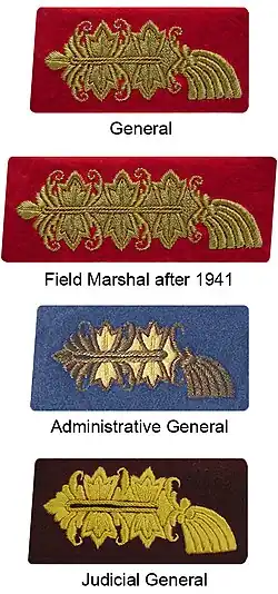 Wehrmachtsbeamte des Heeres im Generalsrang trugen auf den Kragenspiegeln die gleiche Stickerei, jedoch auf dunkelbläulichgrünem statt hochrotem Abzeichentuch, mit Vorstößen in der „Nebenwaffenfarbe“ ihres Verwaltungszweigs (ebenso der Besatzstreifen von Schirm- und Feldmütze; in Dunkelgrün die Ärmelpatten des Waffenrocks und seit Mai 1937 das Brustklappenfutter des Mantels, statt vorher hochrot).[7] Davon abweichend waren bei den Kriegsverwaltungsbeamten (im August 1941 umbenannt in Militärverwaltungsbeamte) im Generalsrang, die ihren Dienst auf Kriegsdauer in den deutsch besetzten Gebieten versahen, die Kragenpatten (und das Brustklappenfutter) hellgrau; dazu bediente man sich des Grundtuchs der Luftwaffe![8] Die Feldpröbste bzw. Feldbischöfe der Wehrmacht galten zwar als Wehrmachtsbeamte mit dem Rang eines Generalmajors, trugen aber nicht deren Kragenstickerei. Stattdessen, auf vermutlich violetten Patten, die goldfarbene Kolbenstickerei der Beamten des höheren Dienstes (analog die Heerespfarrer und - oberpfarrer, die statt der ihnen gebührenden Kolbenstickerei „nur“ die glatten silbernen Kapellenlitzen des gehobenen Dienstes führten; ab 1935 auf violetten, seit 1937 auf blaugrünen Patten).[9]