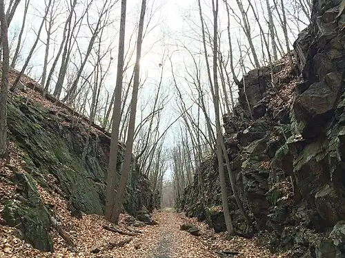 Der Rail trail folgt der Trasse der ehemaligen New York and New England Railroad. Heute wird er bevorzugt als Reitweg (Bridle Trail) genutzt. Der Weg ist 16,6 km (10,3 mi) lang; im Osten beginnt er an Whittemore Glen State Park und führt mit mehreren Bögen nach Norden in südwestlicher Richtung bis zur Kettletown Road in Southbury.[3] Die Eisenbahntrasse führt durch hügeliges Gelände und überquert eine ganze Anzahl von Flüssen und Bächen. Mit 3 % Steigung gehörten die Strecken zu den Strecken mit dem größten Gefälle in Connecticut. Zu den Gewässern, die der Weg passiert, gehören Pigeon Brook mit dem Barbers Pond, Bradley Brook, Long Meadow Pond, Jacks Brook und Little River.
