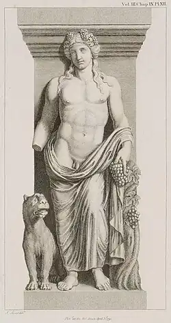 Die im Portikus abgebildeten griechischen Gottheiten und Sterblichen sind im Hochrelief dargestellt. Es handelt sich um acht an der Zahl, die paarweise auf jeder der vier Säulen angeordnet sind. Bei den Figuren handelt es sich um Dionysos, den Gott des Weines; Ariadne, seine Gemahlin und Prinzessin von Kreta; Aura, eine mit der bacchantischen Mythologie verbundene Göttin des Windes; eine Mänade, eine Anhängerin des Dionysos; Leda, Königin von Sparta; Ganymed, Mundschenk der Götter; Nike, die Siegesgöttin; und schließlich einen der Dioskuren, die Zwillingssöhne Ledas. Sie werden wie folgt gepaart: Leda mit Ganymed (zwei Sterbliche, die von Zeus in Tiergestalt verführt wurden), Nike mit der Mänade (enge Gefährtinnen einer bestimmten Gottheit, abwechselnd Athene und Dionysos), Ariadne mit Dioskur (Halbgötter, die schließlich zu Göttern aufstiegen) und Dionysos mit Aura (in einigen Versionen ist Aura die Mutter von Iacchus durch Dionysos).