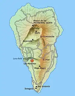 Bei der San Juan-Eruption 1949 entstand an der Westflanke der Cumbre Vieja im Barrio Tacande in 1300 m Höhe der Spaltenvulkan Hoyo del Banco (auch Llano del Banco, meist aber als Vulkan San Juan bezeichnet). Die austretende Lava querte auf ihrem Weg westwärts zum Meer nacheinander die beiden Barrios.[5] Der erste, steile Teil und im Barrio Las Manchas (El Paso) gelegene Lavafluss wird lokal Coladas de San Juan (dt. Lavafluss des San Juan) genannt, der mittlere, breitere und flachere in Las Manchas (Los Llanos de Aridane) gelegene Teil Malpaís de Las Manchas.[6] Die Verringerung der Nutzfläche machte das Wirtschaften noch schwieriger.[2] Der Lavastrom von 1949 ist in beiden Barrios überwiegend noch nicht überwachsen und prägt die Landschaft.