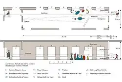 An diesen Aspekt schließt der 1983 erschienene Beitrag von John F. Moffitt[36] an, in dem anhand von historischen Grundrissplänen plausibilisiert werden konnte, dass der gesamte in Las Meninas dargestellte Raum die Wiedergabe eines damals real existierenden Raumes sei, der bereits von Antonio Palomino in seiner Beschreibung von 1724 Erwähnung fand. Dabei soll es sich um ein längliches Prinzengemach mit den Maßen 20,4 m × 5,36 m × 4,4 m in der Südweststrecke des Alcázar, des Königspalastes in Madrid, handeln. Velázquez nun habe diesen Ort für sein Gemälde gewählt, weil er selbst einer der Architekten war, wodurch er seine Zugehörigkeit zu den Artes Liberales zu erkennen gegeben habe.