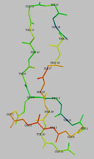 3D-Struktur von Microcin J25. Der Übersichtlichkeit halber sind nur die Backbone-Atome und die Seitenkette von Glutamat gezeigt. Die Farbgebung gibt Information über die räumliche Position der Atome (Rot: vorn, Blau: hinten).