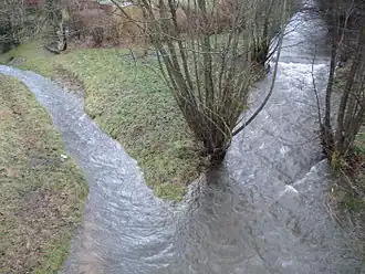 Der Laubersbach (links) mündet in die Lohr. Blick von der Lohrbrücke nach Nordwesten. | ||