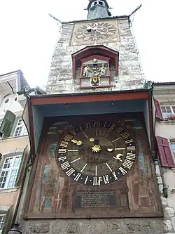 - ↑ Marie-Christine Egger: Der Zeitglockenturm und die astronomische Uhr. ( des vom 11. Dezember 2015 im Internet Archive) Info: Der Archivlink wurde automatisch eingesetzt und noch nicht geprüft. Bitte prüfe Original- und Archivlink gemäß Anleitung und entferne dann diesen Hinweis. (PDF; 43 kB)