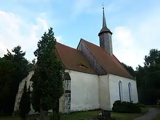 1682 baute man die Kirche wieder auf. Sie besitzt einen mit Holzschindeln gedeckten Kirchturm, der eine Wetterfahne mit türkischem Halbmond trägt. Eine Legende spricht von einem Beutestück aus dem Türkenfeldzug. Wahrscheinlicher ist die Variante, dass der Halbmond an die Teilnahme sächsischer Truppen am Entsatz des 1683 von den Türken belagerten Wien erinnern soll. Kurfürst Johann Georg III., der Vater Augusts des Starken, hatte dazu fünf Reiter- und sechs Infanterieregimenter sowie Artillerie entsandt und somit Anteil am Sieg über die Türkische Armee des Großwesirs Kara Mustapha. Das fiel zeitlich mit dem Wiederaufbau der Kirche zusammen.[2]