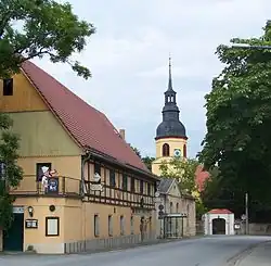Links das Alte Erb-, Brau- und Schänkgut, rechts der Kirchturm