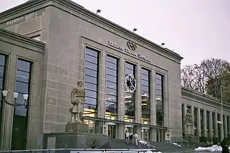1910 nahm der Flugplatz Lausanne-La Blécherette den Betrieb auf. Während des Ersten Weltkriegs verlegte das Internationale Olympisches Komitee IOC unter dem Generalsekretär Pierre de Coubertin den Sitz von Paris nach Lausanne. Von 1916 bis 1919 leitete der Stellvertreter Coubertins und Schatzmeister des IOC, der Waadtländer Godefroy de Blonay, das Komitee. Es entstanden Exilgruppen aus geflüchteten Eliten, wie Weisse Russen. Besonders auffallend war die Präsenz der Lausanner Griechen, die 1922/1924 die Eglise grecque orthodoxe Saint-Gérassimos errichteten. Eine weitere Gruppe waren Rumänen um Michael und Nikolaus und Politiker wie Raoul Bossy und Constantin Xeni,[30] die den Mittelpunkt einer antikommunistischen Exilgemeinde bildeten. Als sich das gegenüberliegende Frankreich im Zweiten Weltkrieg unter deutscher Besatzung befand, berichtete die Zeitung La Gazette de Lausanne über die Morde der Nazis an der Zivilbevölkerung, wie das Massaker von Oradour 1944. Viele Franzosen erfuhren erst durch sie, was in ihrem Land geschah.[31] 1954 entstand das Fussball- und Leichtathletikstadion Stade Olympique de la Pontaise. 1964 veranstaltete die Stadt die Schweizerische Landesausstellung.[32]