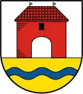 Blasonierung: „In Silber über goldenem (gelbem) Schildfuß, darin eine blaue Wellenleiste, ein rotes Burgtor.“[2] |