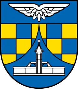 Blasonierung: „Unter blauem Schildhaupt, darin eine silberne Doppelschwinge, ein von Blau und Gold geschachtes Feld mit überhöhter, eingebogener blauer Spitze, darin ein silberner Brunnen.“[7] |