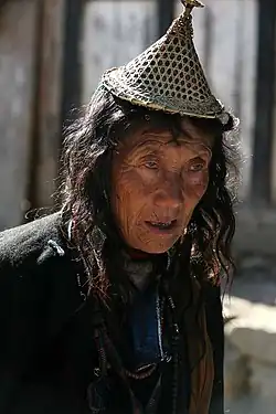 Die Kleidung besteht aus Yakhaar und Schafwolle, die auf Gurtwebstühlen verwoben werden. Die einzelnen Kleidungsstücke der weiblichen Tracht sind ein schwarzes Hemd und ein schwarzer Rock mit hellen Längsstreifen, eine schwarze Wolljacke, schwere Filzstiefel und ein kegelförmiger Hut aus Bambus. Der Schmuck ist meistens aus Silber und wird auf dem Rücken getragen.