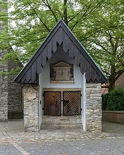 Hinter den Gittern stehen Sandsteinfiguren der heiligen Gertrud (links) und des armen Lazarus (rechts). Eine etwa 65 Zentimeter hohe Sitzfigur zeigt Lazarus und einen Hund, der dessen Wunden leckt. In der Linken hält Lazarus eine Klapper, wie sie Leprakranke tragen mussten, um auf sich aufmerksam zu machen. In der Rechten hält er eine Schale. Eine etwa 80 Zentimeter hohe Standfigur zeigt Gertrud mit Mantel und Äbtissinen-Stab in der Rechten. In der Linken hält sie eine Münze und ist im Begriff, sie in die Schale des Lazarus zu werfen.