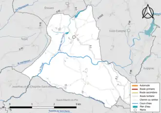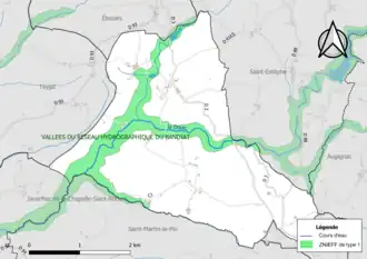 Das Gemeindegebiet wird von der Doue in zwei Hälften geteilt. Die Doue kommt von Saint-Estèphe herüber und fließt anfänglich noch in west-östlicher Richtung. Südwestlich vom Ortskern nimmt sie als rechten Seitenarm den Ruisseau des Forges auf und biegt dann nach Südwesten ab. Die Südgrenze des Gemeindegebiets zu Saint-Martin-le-Pin bildet der in WNW-Richtung fließende Ruisseau de Combas, ein kleiner linker Seitenbach der Doue.