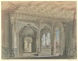 - In der Haremsszene baute Petipa einen Walzer aus Adams Originalpartitur zu einem Pas de trois für drei Haremsdamen aus. Dieser ist bekannt als Pas des odalisques („Tanz der Odalisken“) und wurde ursprünglich von Anna Prikhunova und den Zwillingsschwestern Nadezhda und Anastasia Amosova getanzt.[1] Die zusätzliche Musik der Variationen 1 und 2 schrieb der damalige Komponist des kaiserlichen russischen Ballettes Cesare Pugni.[1]