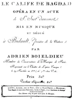 Le calife de Bagdad wurde vom Pariser Publikum gut aufgenommen;[2] Luigi Cherubini, der Boieldieu in Paris unterstützte, fragte ihn, „ob er sich wegen des unverdienten Erfolges nicht schäme“, woraufhin Boieldieu bei ihm Unterricht nahm.[3] Der deutsche Musiktheoretiker Gottfried Weber hingegen kritisierte die Oper als alltäglich mit nur wenigen gelungenen Stellen und unbedeutendem Dialog.[4] Le calife de Bagdad gehörte über Jahrzehnte zum Repertoire des Théâtre de l’Opéra-Comique; die letzte Neuinszenierung stammte aus dem Jahr 1875. Auch außerhalb Frankreichs wurde die Oper immer wieder aufgeführt. Dabei wurden teilweise die Rollennamen und auch der musikalische Inhalt verändert, so beispielsweise in der deutschen Bearbeitung von Fritz Schröder aus dem Jahr 1939. Auch das Thema wurde häufig aufgegriffen, etwa 1813 in Manuel Garcías Il califfo di Bagdad sowie 1826 in Gioachino Rossinis Adina ossia Il califfo di Bagdad.