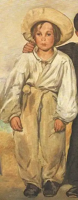 Die Hauptlichtquelle wirft das Licht direkt von vorn auf das Gesicht des Kindes, sodass der Bildhintergrund direkt hinter dem Kopf am hellsten erscheint, sich aber keine Schatten abzeichnen. Ein zweiter, schwächerer Lichteinfall richtet sich von links oben auf den Fußbereich des Kindes, wodurch in diesem Bereich nach rechts hinten fallende Schatten sichtbar werden. Während große Teile des Gemäldes mit flüchtigem Pinselstrich eher skizzenhaft gemalt sind, ist das Gesicht des Jungen feiner ausgearbeitet. In dieser Weise hat der Künstler die schwarzen, gescheitelten Haare mit einem leichten Seidenglanz wiedergegeben und den vollen Wangen und der Nase eine rosige Tönung verliehen. Unter dem kleinen geschlossenen Mund mit seinen rötlichen Lippen befindet sich ein kleines Grübchen. Das Kind scheint den Betrachter mit seinen dunkelbraunen Augen direkt anzusehen. Der Blick des Kindes wird von verschiedenen Autoren als ernst[3] bis melancholisch[2] beschrieben.