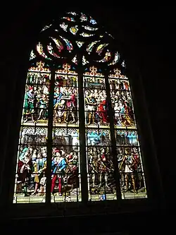 Das viergeteilte Fenster stammt aus einer unbekannten Werkstatt. Es stellt das Leben von Bertrand du Guesclin († 1380) dar, der ein bedeutender bretonischer Heerführer und Connétable von Frankreich war. Unten wird seine zweite Heirat mit Jeanne de Laval-Tinténiac (um 1360–1433) im Jahr 1373 thematisiert. Das Schloss Montmuran wurde von Jeanne de Laval-Tinténiac in die Ehe eingebracht.